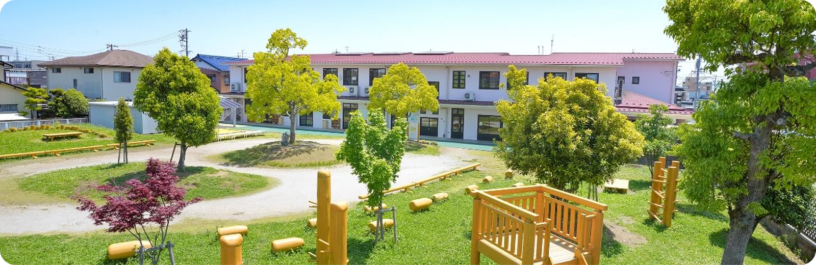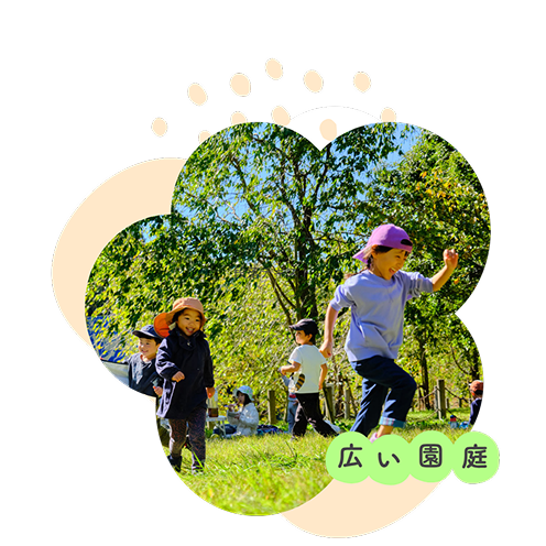 ひまわり保育園は式の草花に囲まれた広大な天然芝の園庭を